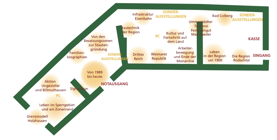 Über die ehemalige Grenze hinweg wird die Geschichte einer Region in Franken und Thüringen gezeigt, die 40 Jahre lang geteilt war. Der Rundgang durch das Zweiländermuseum bringt sie vom Leben in einer ländlichen Region um das Jahr 1900 über gesellschaftliche, politische, technische und wirtschaftliche Umwälzungen bis in das 21. Jahrhundert. Im Mittelpunkt bleibt dabei immer das Erleben der Menschen in ihren Dörfern und kleinen Städten.